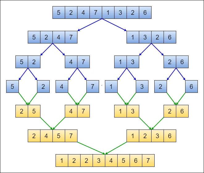 - 정복(Conquer): 나누어진 작은 배열들을 2개씩 쌍을 이루어 정렬하면서 병합(Merge)한다. 이 과정을 모든 배열이 다시 하나로 합쳐질 때까지 반복한다.