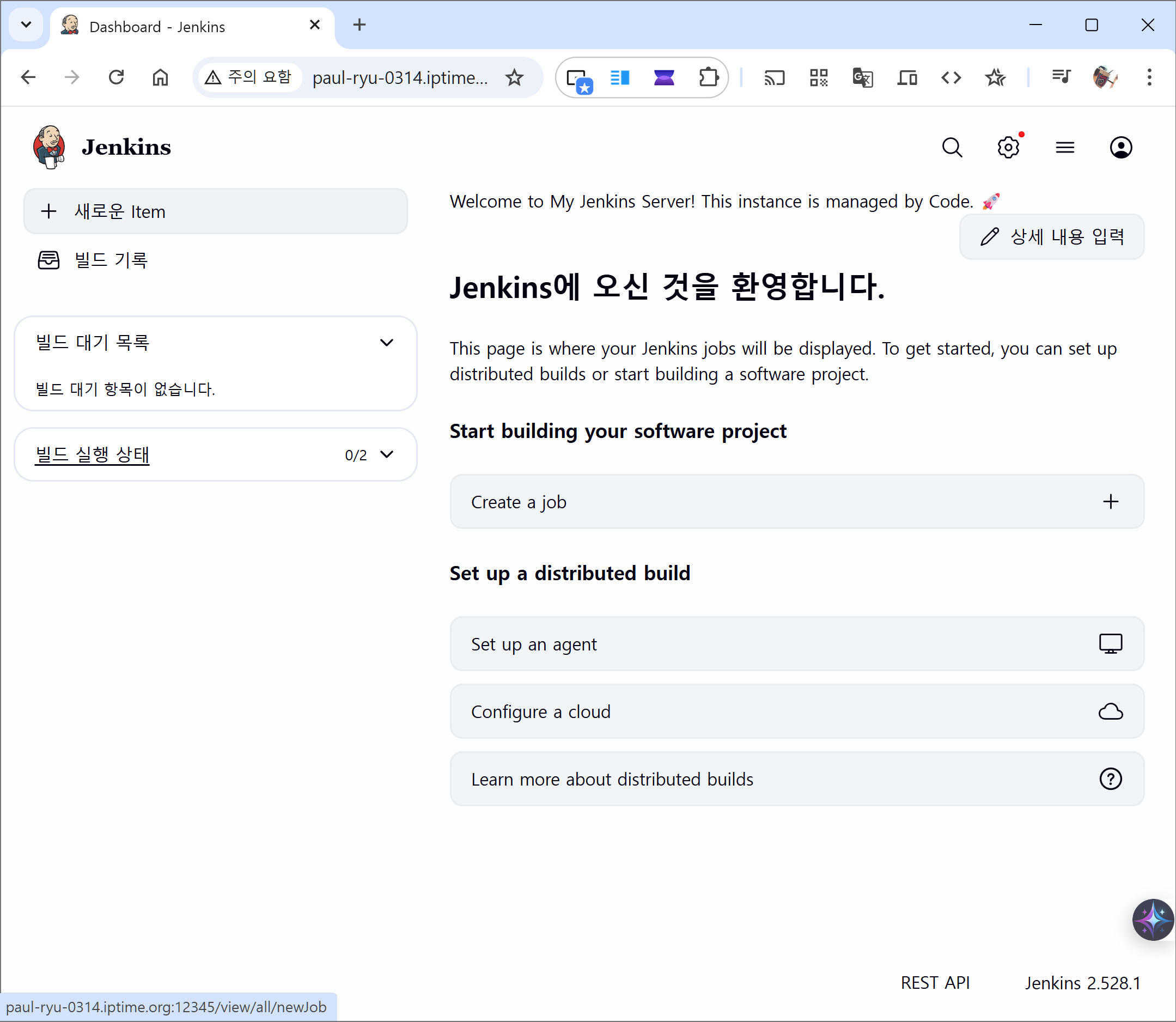 jenkins_home디렉터리를 생성했다. (나의 경우chown은 불필요했다.)mkdir jenkins_home docker compose up --build -d명령어로 젠킨스 빌드 및 실행.docker logs jenkins-server로 초기 관리자 비밀번호 확인.http://paulryu9309.ddns.net:12345(서버 IP와 변경된 포트)로 접속하여 설정 마법사(플러그인 설치, 관리자 계정 생성)를 완료했다.- 젠킨스 대시보드에서